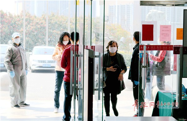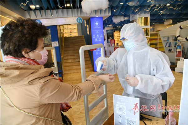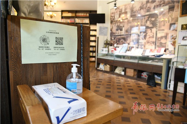 在栈桥书店,记者看到门口的工作人员,认真为进入书店的市民测量体温,发放号码牌,并提示市民“请尽量将购书时间压缩在15分钟内”。
