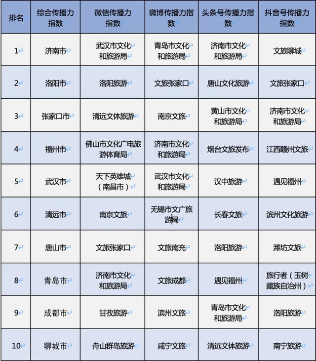 基于对全国地级文旅部门的微信、微博、头条号和抖音号传播力的综合评价,2020年6月全国地级文旅新媒体综合传播力指数TOP10排序为: 济南市、洛阳市、张家口市、福州市、武汉市、清远市、唐山市、青岛市、成都市、聊城市。