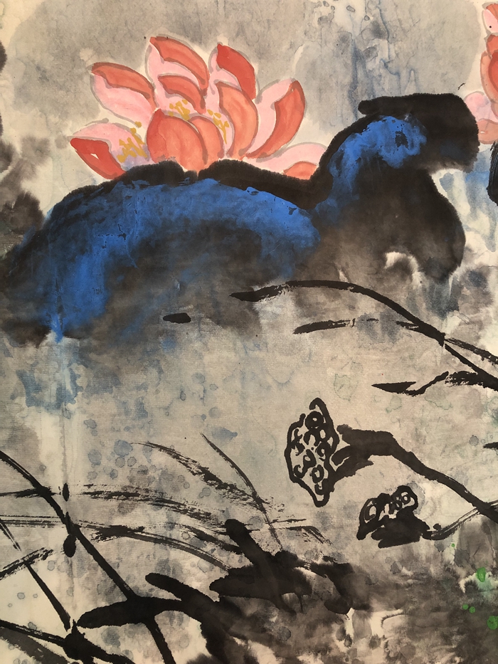 其次,在画卷的笔墨表现上,金永辉也做了精彩赏析。“在绘画的用笔用墨方面,刘海粟是有传承的,他的作品不存在完全的‘死墨’,仔细观察可以发现,他的用墨有着多种层次的浓淡变化,精彩,鲜活。一件泼彩荷花作品是否成功,取决于两个关键因素:水与色。水分控制不好,莲叶宛如一堆烂泥;色彩把握不好,画面驳杂花乱,没了章法。而刘海粟早期有着中国画与油画创作的双重积淀,用水用色了然于胸,晚年的泼彩荷花是水到渠成的自然收获。”纵观整幅画面,线条肯定,虚实有致,荷花茎杆的表现也是一波三折,十分生动。此外,画面的中下部还通过小范围的泼墨营造了一种浓厚的氛围,点点斑斑似水面涟漪,也犹如荷塘中的浮萍一般。除了盛放的荷花外,卷曲的荷叶、残叶等也都能在画面中找到,这就十分的丰富真实,也体现出了画家善于观察生活的一面。“刘海粟对空间的处理和对笔墨深刻的理解,都通过他笔下线条的相向、相悖、有次序有节奏的过渡逐一显现出来。画面中的每一支荷花之间都是相互照应的,在颜色的运用上他也是顾全大局,将石青巧妙的分布于画面之中,这就让整个画面更相容,更和谐” 。