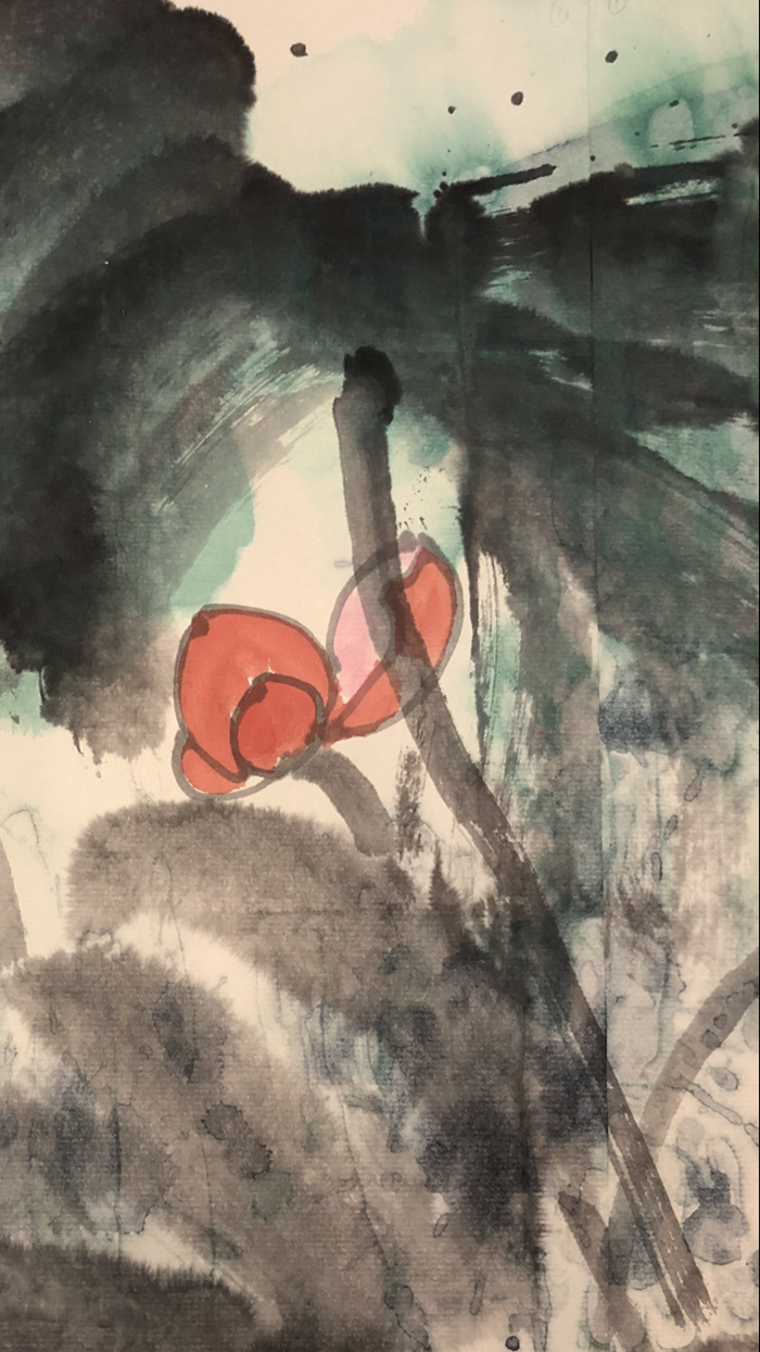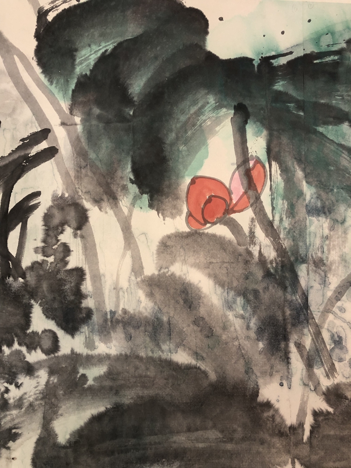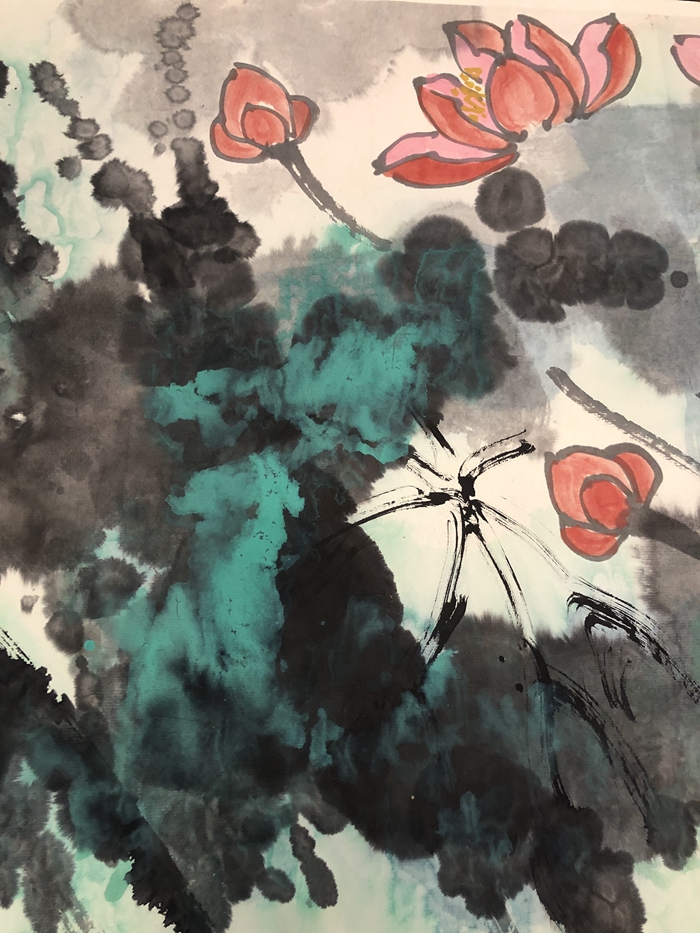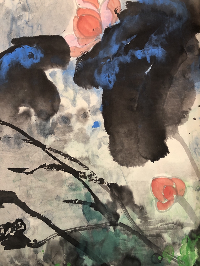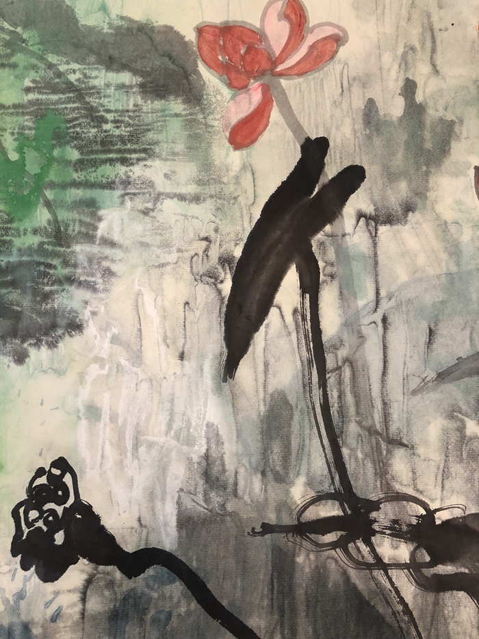 细观此幅长卷,开题“清殿遗风”后,一池荷花的美丽景象就徐徐展开,通过画面中对荷花及叶子的表现来看,在创作时,他充分运用了宣纸的渗墨特性,把深浅不一的墨块横涂竖抹,变幻莫测,气象万千。在大片泼墨、泼彩形成荷叶之后,他再补以花瓣、荷茎、浮萍等,构成色块与线条的互动。在整幅画面中,他还运用了泼墨、积墨等手法,营造出水墨变幻之境,浓、淡、干、湿,自然渗化,不由得让人联想到李义山的诗句“留得残荷听雨声”,使观者徜徉在一片无尽的诗意中。