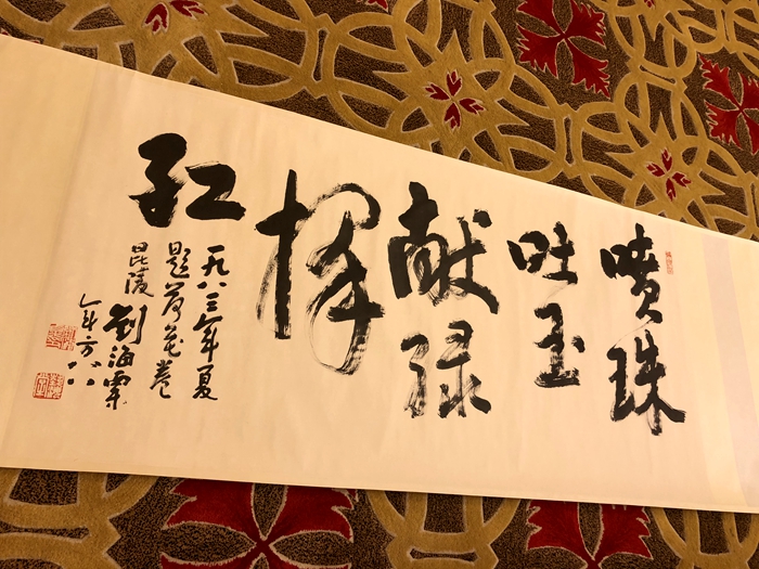 元植说:“ 88岁对很多常人来说是人生即将谢幕了。但是对刘海粟来说还不是,他88岁还能爬黄山,说话中气十足,能写大字,其生命之旺盛在长卷最后‘喷珠吐玉献绿择红’这几个气势雄壮的字上也可以看出。所以说刘海粟是我们的楷模,他们生活的时代比较贫穷,战乱频生,他也是历经磨难,饱经沧桑,但他十分长寿,艺术激情一直到最后时刻仍在迸发。大家气象,高山仰止,实在令人惊叹!”